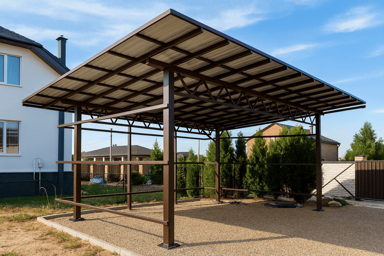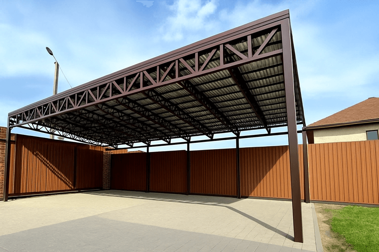 Односкатный навес — это практичное решение для защиты автомобиля, зоны отдыха или хозпостройки от осадков и солнца. Благодаря своей конструкции он прост в реализации и отлично подходит для участков с ограниченным пространством. Мы реализуем односкатный навес с учетом ветровой и снеговой нагрузки, рельефа и пожеланий заказчика.